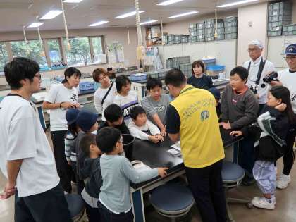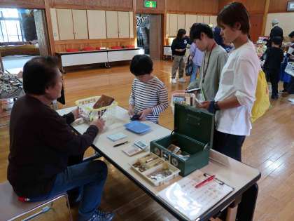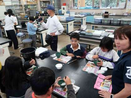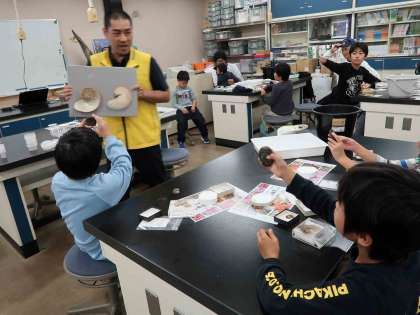 博物館見学の後は、化石のレプリカ作り体験をしました。本物のアンモナイトの化石から型を取ったレプリカを作りました。先生方、一回だけ作り方の説明を受けながら実際の手順を見せてもらい、その後に全員がレプリカを制作しました。魔法の粉を入れた後は、手を止めずに最後まで石膏を型に流し込みます。みんな真剣に制作しました。完成したレプリカは、一人一人ビニルに入れてもらいました。宝物ができました。