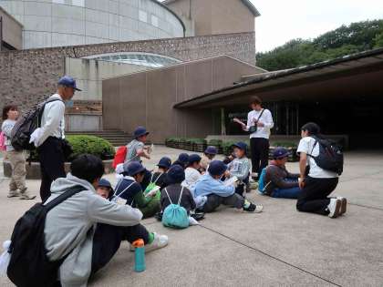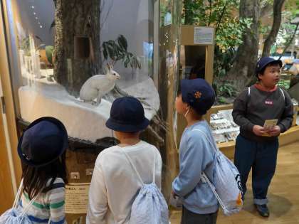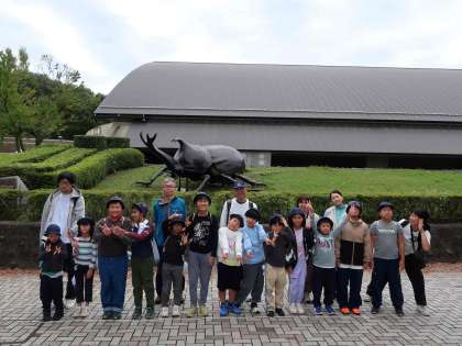 最終日のお楽しみは、群馬県立自然史博物館見学です。恐竜や人間の進化の歴史など、魅力的な展示がいっぱいです。カブトムシが出迎えてくれました。記念写真を撮って館の方からのお話を聞いてさあ見学です。