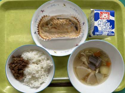 牛乳、七分づきごはん、かつお沢庵、カマスの醤油マヨ焼き、塩豚汁