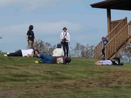三日目の昼食な鳥めし弁当です。甘辛く焼かれた鶏肉のお弁当を食べました。気持ちの良い青空のもと、芝生の上でおいしくお弁当をいただきました。