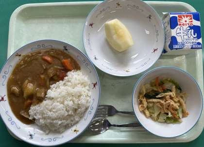 牛乳、ポークカレーライス、カリカリ油揚げのサラダ、リンゴ