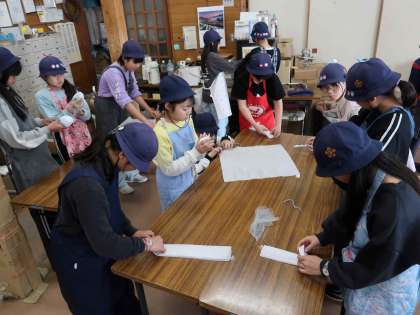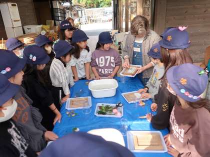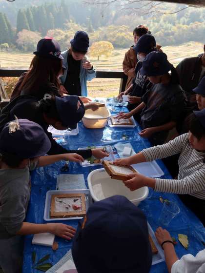 制作する和紙の中に入れた植物を自然の中から探すところからから教えてもらいました。制作の仕方を教えてもらってから、思い思いに完成をイメージして紙すきをしました。完成したはがき大の和紙は、アイロンがけをしてから乾かし、ガラスに張り付けてさらに乾燥させました。額に入れたら素敵な飾りになります。