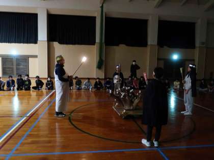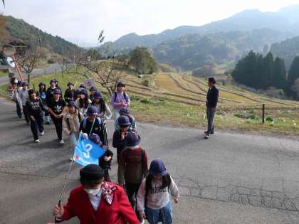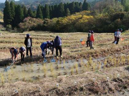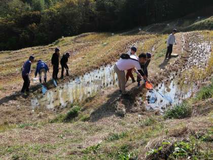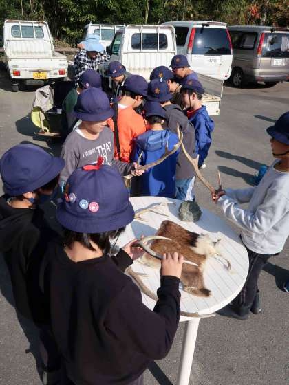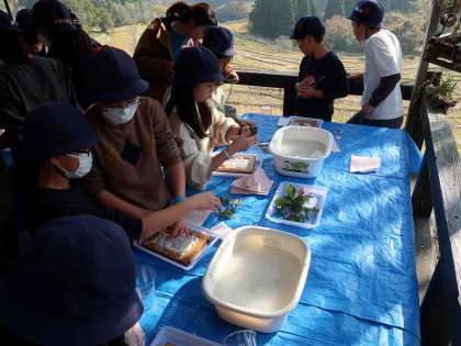 大山千枚田付近に住む生き物や地質のことなど様々なことを教えてもらいました。実際の骨格標本や皮を触らせてもらいました。また、実際に田んぼに入り生き物をゲットしました。何気なく見ているだけでは気づかないことがあり、見方を変えるといろいろな発見があることを体験しました。