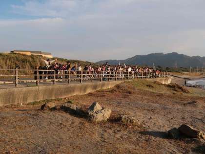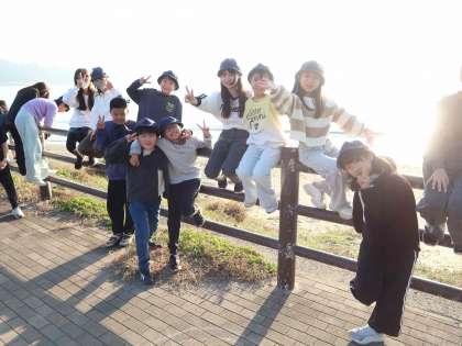 画像は、学年写真を岩井海岸で撮影した後に海を眺める子供たちです。西の海の上に傾く夕日に向かってすてきな景色を目にやきつけています