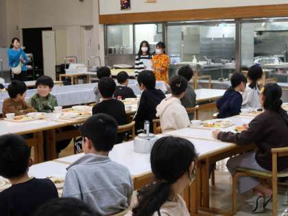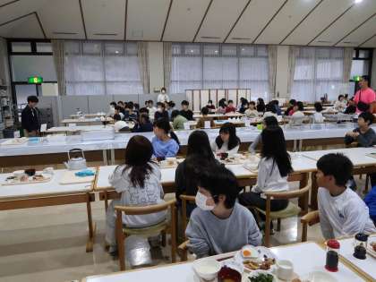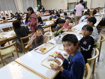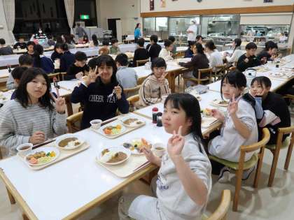 二日目の夕食は、カツカレーです。みんなおいしくいただきました。おかわりをするお友達がたくさんいました。元気の証です。明日の元気も夕食で得られます。これから夜のレクリエーションもみんなの気持ちを一つにして、盛り上がれそうです。