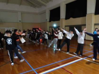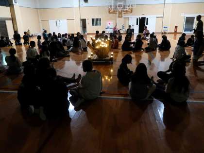 二日目の夜は、キャンドルファイヤーを体育館で行いました。「友情の火・努力の火・勇気の火」の三つの火を火の神様から頂き、明るい未来を築いていこうと心に誓いました。ダンスにゲームに歌に、全員の心を一つにしていつまでも終わらないでほしいという思いを抱く時間でした。あっと言う間の時間でした。いつまでも忘れたくない時間になりました。企画運営をしてくれたファイヤー係のお友達に感謝です。そして、全員の協力に感謝です。