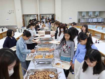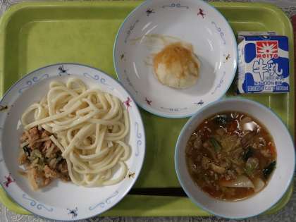 牛乳、味噌煮込みうどん、大根のごまあえ、チーズ芋もち