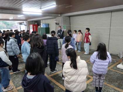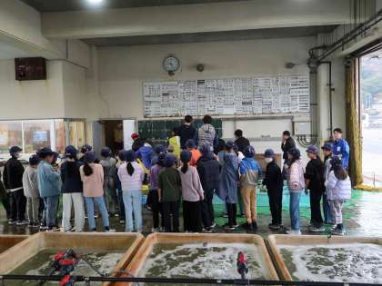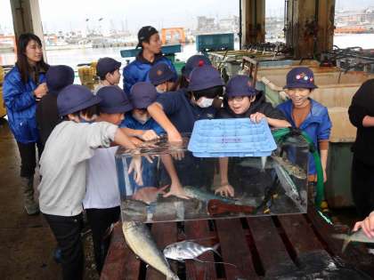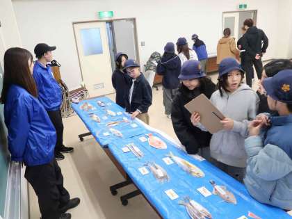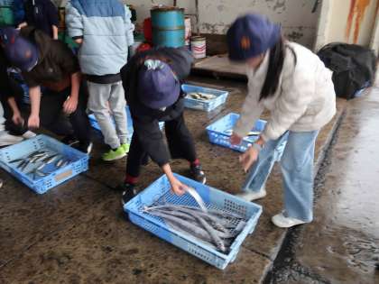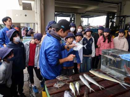 漁港の仕事の一つである魚種の選別を体験しました。シイラやホウボウ、太刀魚など、色々な魚の説明を聞いた後に、班ごとに選別作業を行いました。最後には、各自がお気に入りの魚を持ってクラス写真をパチリ。