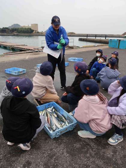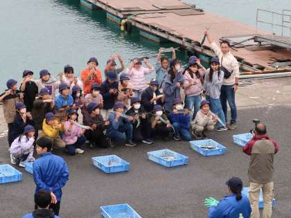 保田漁港で水あげされている色々な魚や定置網漁の仕組みを教えてもらいました。実際の魚に触れることが出来たり、実際の入札を見学することができたりと、とても貴重な体験をしました。
