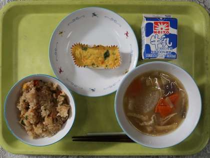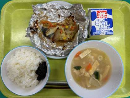 牛乳、七分づきごはん、のりの佃煮、鮭のちゃんちゃん焼き、五目汁