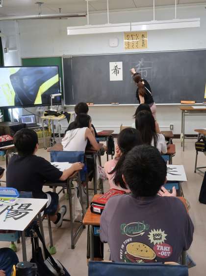 5年生が体育学習発表会で着るはっぴに好きな漢字を一字書いていました。チャコペンを使って真剣に書いています。体育学習発表会が終わっても思い出のはっぴになること間違いなしです。