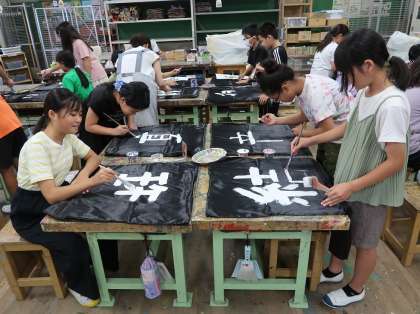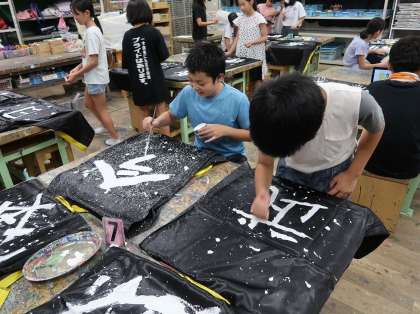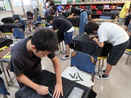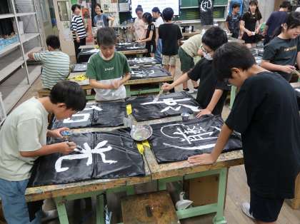 下書きをした5年生が、白のアクリル絵の具で一文字をダイナミックに書いていました。体育学習発表会の表現演技で着る衣装のようです。思い出の半被になりそうです。