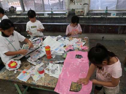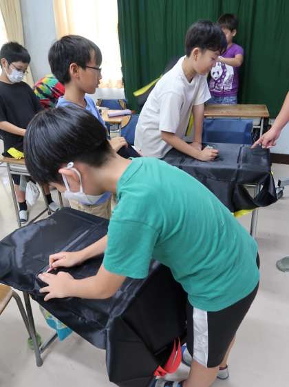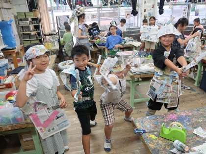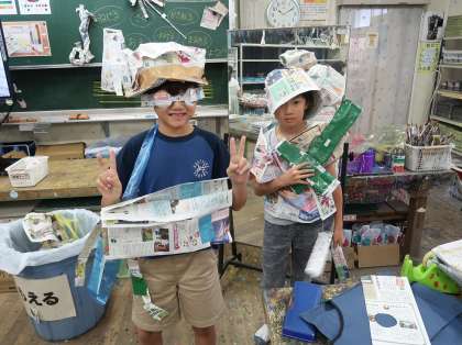 3年生が図工の時間に新聞紙でオリジナルの衣装を制作していました。思い思いの衣装を夢中で制作しています。完成後は、記念写真を撮ったり、友達となりきって遊んだりしていました。個性輝く作品です。先生も衣装を率先してかぶっていました。子供たちは大喜びです。