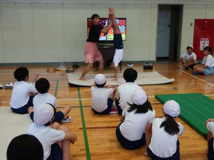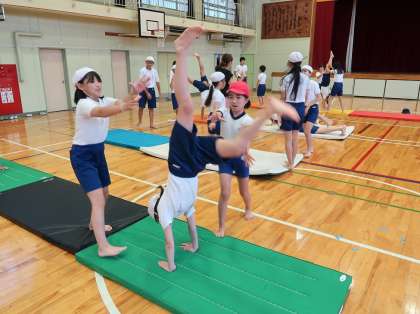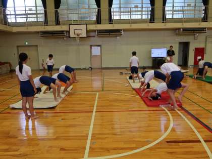 6年生が体育館でブリッジや倒立などの運動をしていました。体育科としては、多様な動きを経験させていますが、体育学習発表会に向けての取り組みでもあるようです。自分が持っている力に合わせて、行い方を選んだり補助を付けたりしています。日ごろ行わない動きに挑戦しています。行い方のコツを理解して、部分部分の動きを経験してから一連の動きを行うことで、技を完成させていました。