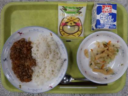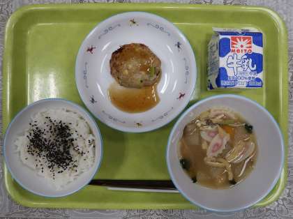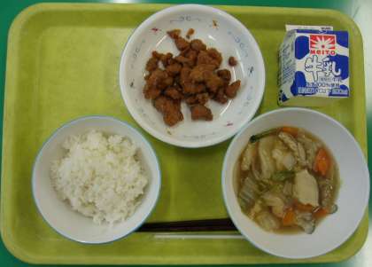 牛乳、七部づきごはん、畑のお肉油淋鶏ソース、五目すいとん