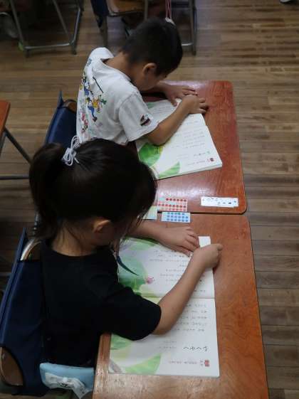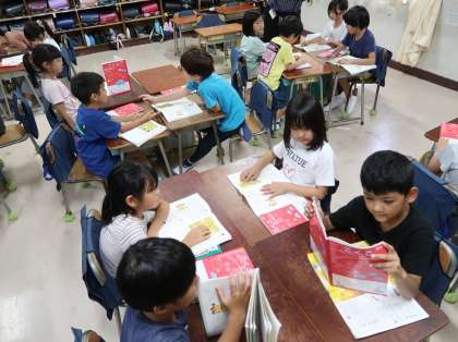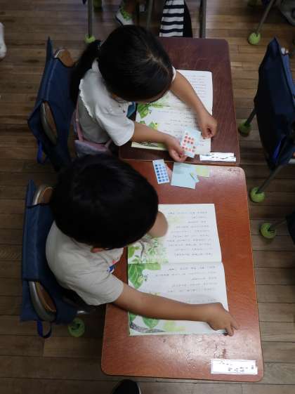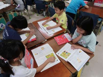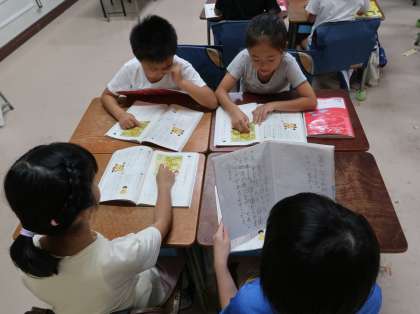 1年生が国語科の物語の学習で、登場人物を探していました。三匹のあお虫が登場するのですが、だれがお話しているのか書かれていません。物語の流れの中で文脈から何色の青虫なのかを探し当てていました。分かったお友達が元気よく手を挙げています。その後は、色のシールを貼って分かりやすくしています。