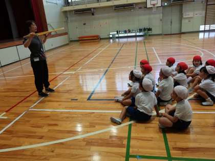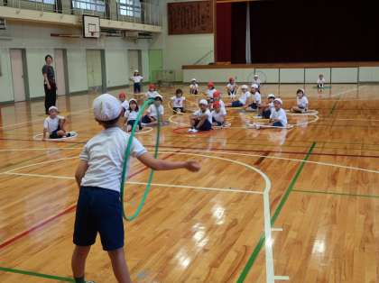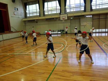 暑い日が続いていますが、体育館では空調設備を効かせて体育を行っています。2年生は、身体のいろいろな部位でフラフープを回して遊んでいました。腰だけでなく腕や首でもまわしていました。体育学習発表会でも行うのでしょうか?