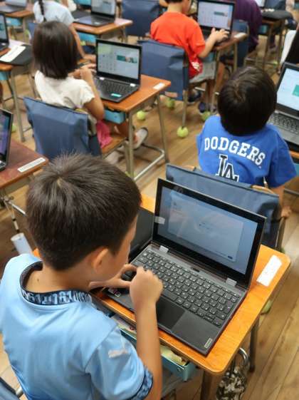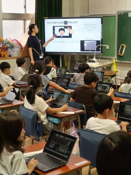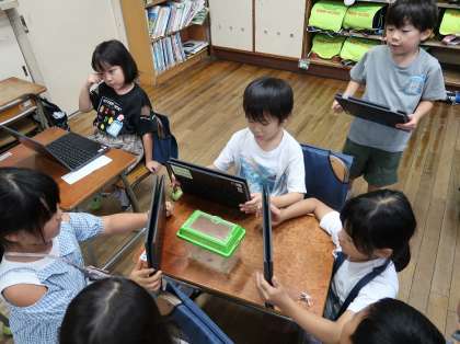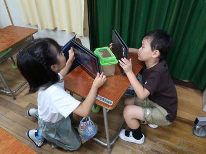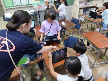 タブレットを使い始めた1年生です。今回は、バッタの画像を撮っていました。画像を撮ることで、新たな発見ができるかもしれません。また、色々な生き物を画像で比較することで、新たな発見があるかもしれません。使うことで慣れていきます。
