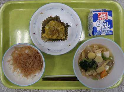 牛乳、七分づきごはん、ピリピリしらたき、菊花しゅうまい、菊花汁
