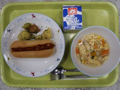 牛乳、チリコンカンドッグ、イタリアンスープ、青海苔ポテト