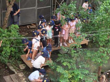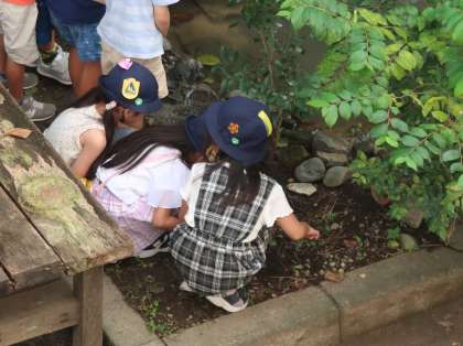 1年生が中庭で自然観察をしていました。池をのぞき込んだり草を見たりして、いろいろな発見をしていました。実際にフィールドに出ることで体験的に学びが深められます。