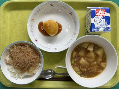 牛乳、七分づきごはん、ピリピリしらたき、じゃがいものそぼろ煮、月見だんご