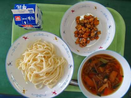 スパゲティナポリタン・パリパリサラダ・いちごミルクゼリー(お誕生日デザート) 2年 国語「動け!おもちゃ王国」