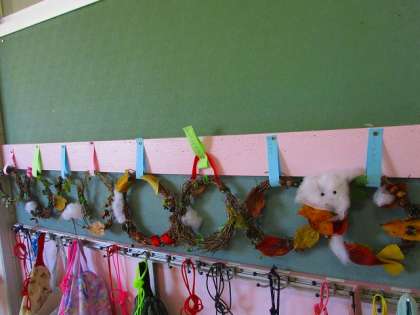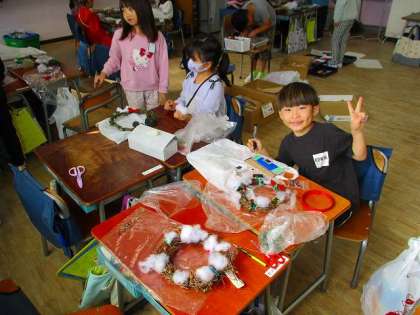 1年生は、中里郷土の森で集めた秋の木の実や落ち葉を使って、リースづくりに取り組みました。