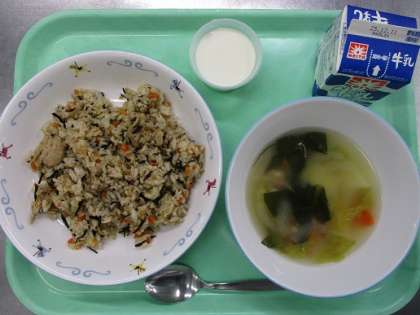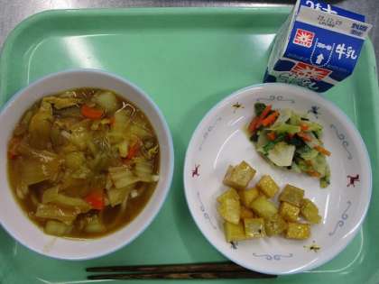 ★卵スープ ★牛乳 特別時程なので食べやすい献立にしました。 高野豆腐のそぼろ丼は、高野豆腐に味がよくしみこんでいて 人気でした。 11月19日(水)の給食