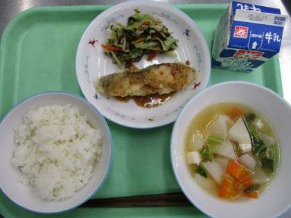 ★魚のあずま煮 ★磯香和え ★かぶのすまし汁 ★牛乳 魚のあずま煮とは、「煮る」という字が入っていますが、揚げた魚に甘辛いタレをかけた料理のことをいいます。今日は魚にでんぷんをつけて「カラっと」揚げた後、ごまが入った甘辛いたれをかけました。白いごはんがよく進むメニューでした。 12月5日(金)の給食