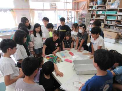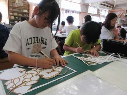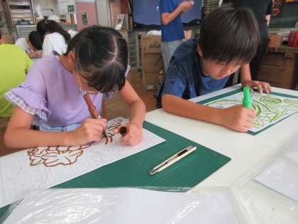 切り取りが終わり版ができたあとの作業の仕方を先生が見本を示してくれました。楽しい作品が出来上がりそうです。