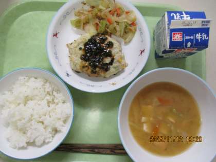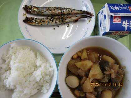 ・牛乳 ・ししゃもの利休焼き ・五目うま煮 です。 今日の、「ししゃも」は白と黒のごまをたっぷりまぶした利休焼きです。ごまの香りが香ばしかったです。五目うま煮は、それぞれの食材にしっかり味がしみておいしかったです。 11/18 1、2年生遠足