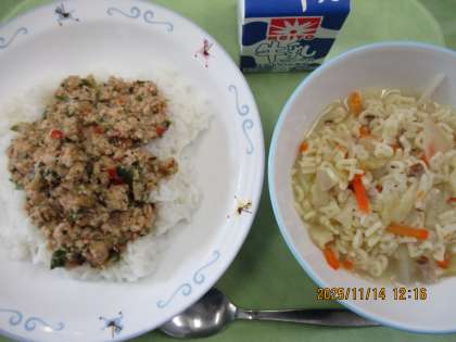 ・牛乳 ・ABCスープ です。 今日は、タイ料理の一つ「ガパオライス」を作りました。バジルやナンプラーなどの調味料をつかいました。食べやすいように、調味料は加減しています。バジルの香りもよくおいしくできました。ABCスープはみんな大好きなスープです。どちらもよく食べてくれました。 今日の給食 11月13日(木)