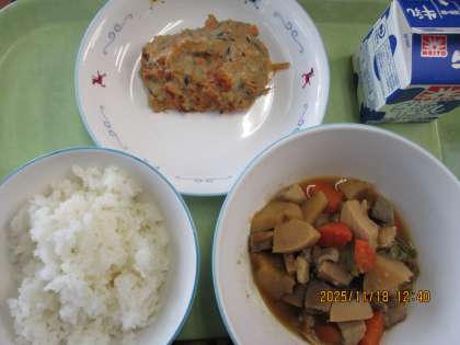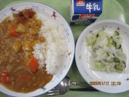 ・牛乳 ・大根サラダ です。 カレーライスの人参とサラダの大根は練馬区内でできたものです。大根は柔らかく辛みもないので、サラダもさっぱりしておいしかったです。インフルエンザでお休みする人が増えてきました。うがい手洗いして、しっかり食べましょう。 今日の給食 11月14日(金)