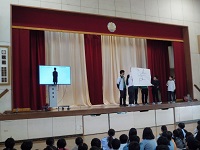 集会では、舞台の間を通った先生が誰かを当てるという内容でした。選択肢は3つあり、3人の先生のうち1人だけ正解の先生がいます。答えがわかっても声に出して言わないよう、正解の先生だと思う時に手を挙げるというルールとなっていました。 ヒントは2つあり、シルエットと正解の先生の声だけを聞くことができます。クイズは全部で4問出題されました。どうやら緑小学校には同じような服や髪型、声の先生がいるようで、児童にとって難しい問題がいくつかあったようです。 どの学年の児童も、楽しそうにクイズに参加していました。 集会委員会の皆さん、楽しい時間をありがとうございました! 11/18 ぼくらはユニバーサルデザイン探検隊【4年生】