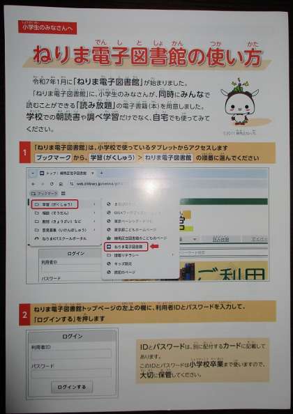 利用については、学校より配付をいたしました「ねりま電子図書館の使い方」をご覧ください。 ご家庭でも、ぜひ、ご利用ください。