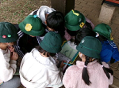 ゴールの宝箱の中には、先生たちのひみつが書かれた紙が入っています。 「へぇ、そうなんだ」 と嬉しそうに読んでいました。どんな秘密があったのかは、子供たちに聞いてみてください。 (写真)2年生は、1年生のことも気にかけながら公園の中を回りました。難しいミッションでは、班で円になりみんなで考えました。