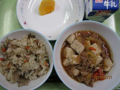 ・牛乳 ・すき焼き風肉豆腐 ・くだもの (柿) です。 今日は、季節の味まいたけの炊き込みごはんです。まいたけは味がよいので、見つけたら舞い上がるほどうれしいといわれているキノコです。油揚げやごぼうと一緒に味付けしたものをごはんに混ぜました。肉豆腐も「とってもおいしかった」と声をかけてもらいました。柿は日本原産のくだものです。「柿が赤くなると医者が青くなる」ということわざがあるように、ビタミンたっぷりのくだものです。 九九検定【2年生】
