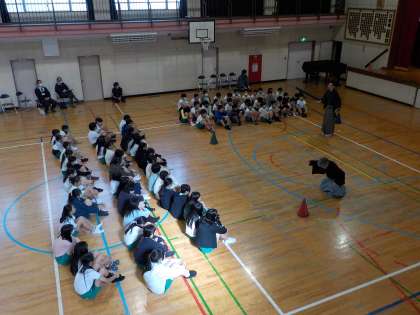 11月12日(水)、万作の会の方々にお越しいただき、6年生が「練馬区立小学校狂言ワークショップ」を行いました。「狂言」は、約600年の歴史をもつ日本の伝統芸能です。講師の皆様による狂言「盆山(ぼんさん)」の上演後、演目の解説や狂言独特の節回し、「すり足」、「大笑い」といった所作について体験を行いました。国語の学習で狂言「柿山伏」を学習した子供たちにとって、古典芸能の世界に親しみ、学びを深めるよい機会となりました。