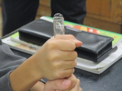 11月5日(水)、4年1組の理科の時間です。「ものの体積と温度」の学習です。石けん水の膜を張った試験管を手であたためらどうなるか実験をしていきました。上向きの試験管、下向きの試験管と同じように実験し、わかったことから、どんなことが言えるか、話し合っていきました。