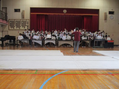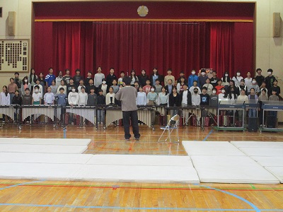 1年生が演奏を聞きたいと来ています。 立派な姿で臨んでいます。高音が美しく響いています。 (写真)斉唱より