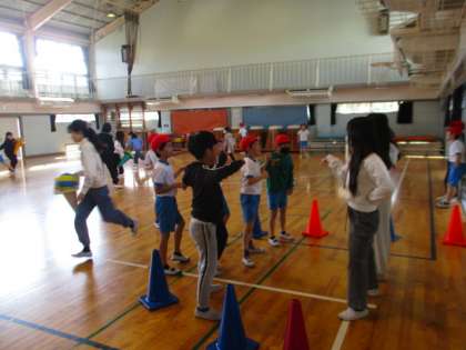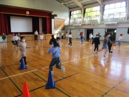 今日が最終日で、3年生が運動委員会版ドロケイを楽しみました。アイスに見立てたグッズを持った鬼につかまると、決められた場所で待機となりますが、そこでダンスを踊ると脱出できるという少し変わったルールです。3年生は、最初ルールに戸惑いながらも、すぐに理解して楽しそうに体を動かしていました。 |