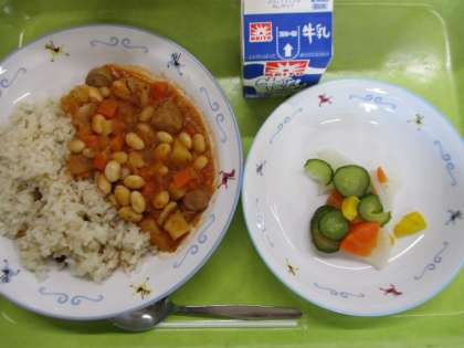 ・フェイジョアーダ ・ピクルス ・牛乳 フェイジョアーダは、豆と肉を煮込んだブラジルで食べられている国民食です。ご飯や野菜などと一緒に食べるのが一般的です。給食ではインゲン豆と大豆を入れ、食べやすいようにしています。良質なたんぱく質がいっぱいの料理です。 運動週間(運動委員会)