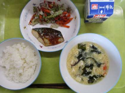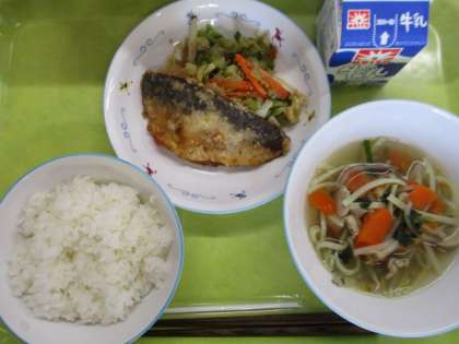 ・さばのねぎみそがけ ・野菜のゆかり和え ・むらくも汁 ・牛乳 旬のさばです。この時期のさばは、脂がよくのっています。10月〜11月頃のものを「秋さば」、12月〜2月頃のものを「寒さば」と呼びます。さばの脂には、脳の働きを良くする栄養がたくさん含まれています。今日の給食では、焼いたさばにねぎみそソースをかけました。さばが引き立つ味付けです。 11月19日(水) 今日の給食