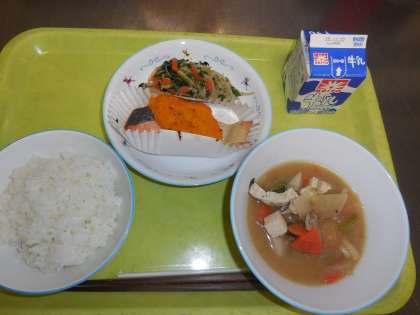・魚の紅葉焼き ・野菜のからし和え ・豚汁 ・牛乳 昨日11月24日は「いい(11)にほん(2)しょく(4)」の日でした。それにちなんで今日は和食の献立にしました。 魚の紅葉焼きは鮭の上におろした人参と玉ねぎをマヨネーズに合わせてかけました。魚にかけて焼くと山の紅葉のようにきれいな色になることから紅葉焼きという名前がついています。 11月21日(金) 今日の給食