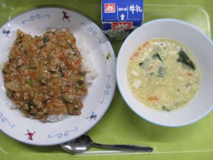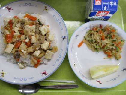 ・切り干し大根のナムル ・くだもの(りんご) ・牛乳 今日の果物は、りんごです。りんごは、古くから食べられている果物です。日本では、明治時代、アメリカからの苗木を栽培したのが始まりと言われています。今では、青森県や岩手県、長野県など、りんごの栽培に適した北の地方や涼しい地域で積極的に栽培されています。りんごには、お腹の調子を整える食物繊維が多く含まれています。よく噛んで味わってみてください。 11月26日(水) 今日の給食