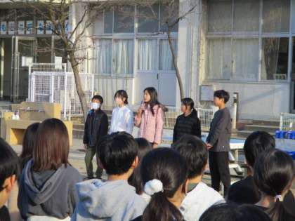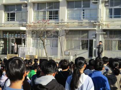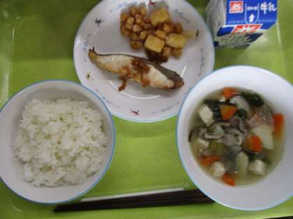 ・魚のしょうが風味焼き ・みそ豆 ・塩豚汁 ・牛乳 今日のみそ豆は、揚げた大豆と高野豆腐をみそだれにからめています。大豆は、お米とともに古くから栽培されている穀物の一つです。豆腐やみそ、しょうゆなど様々な食品や調味料に加工され、昔から日本人にとって馴染みのある食べ物です。動物の肉と同じように脂質やたんぱく質といった栄養素を多く含んでいるので「畑の肉」とも呼ばれています。大豆を食べて元気に生活しましょう。 全校朝会