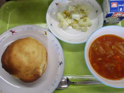 ・コーンポテト ・ミネストローネ ・牛乳 ビスキュイとは、フランス語で、「ビス」は二度、「キュイ」は焼くという意味です。実際には、ビスケットやクッキーなどの焼き菓子のことを言います。今日は、ミルクパンの上に小麦粉、卵、砂糖、バターで作ったクッキー生地をのせて焼きました。こんがり焼き上がって、ほのかな甘みを感じます。ミネストローネの酸味とのバランスもよいです。 12月3日(水) 今日の給食