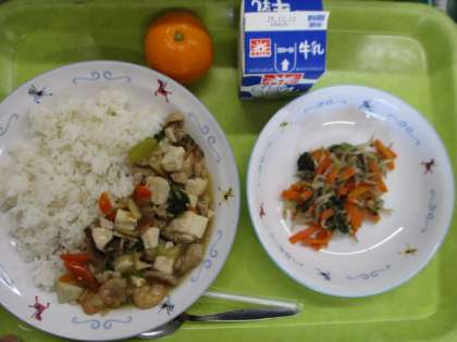 ・シャーレン豆腐 ・野菜のみそいため ・くだもの(みかん) ・牛乳 シャーレン豆腐とは、えびや豆腐、野菜が入った中華あんかけのことを言います。中国語でシャーレンの「シャー」はえび、「レン」は皮をむいたという意味があり、むきえびのことです。給食にも小さなえびがたくさん入っています。えびや豆腐には、丈夫な体をつくるもとになるたんぱく質が多く含まれています。不足しがちな栄養素なので、しっかりと食べて丈夫な体をつくりましょう。 12月4日(木) 今日の給食