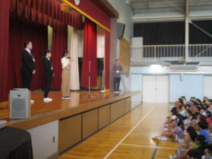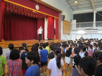 最後に、夏休みの生活について留意点や心がけるとよいことなどを確かめました。特に、生活リズムを整えることは、5・6年生の代表委員の児童が、「朝ごはんをしっかり食べる」、「テレビやゲームをやる時間を決める」などの自分のめあてを話し、みんなにも呼び掛けました。夏休み、子供たちが安全に留意し、生活リズムを整えて、充実した時間を過ごせるように願っています。